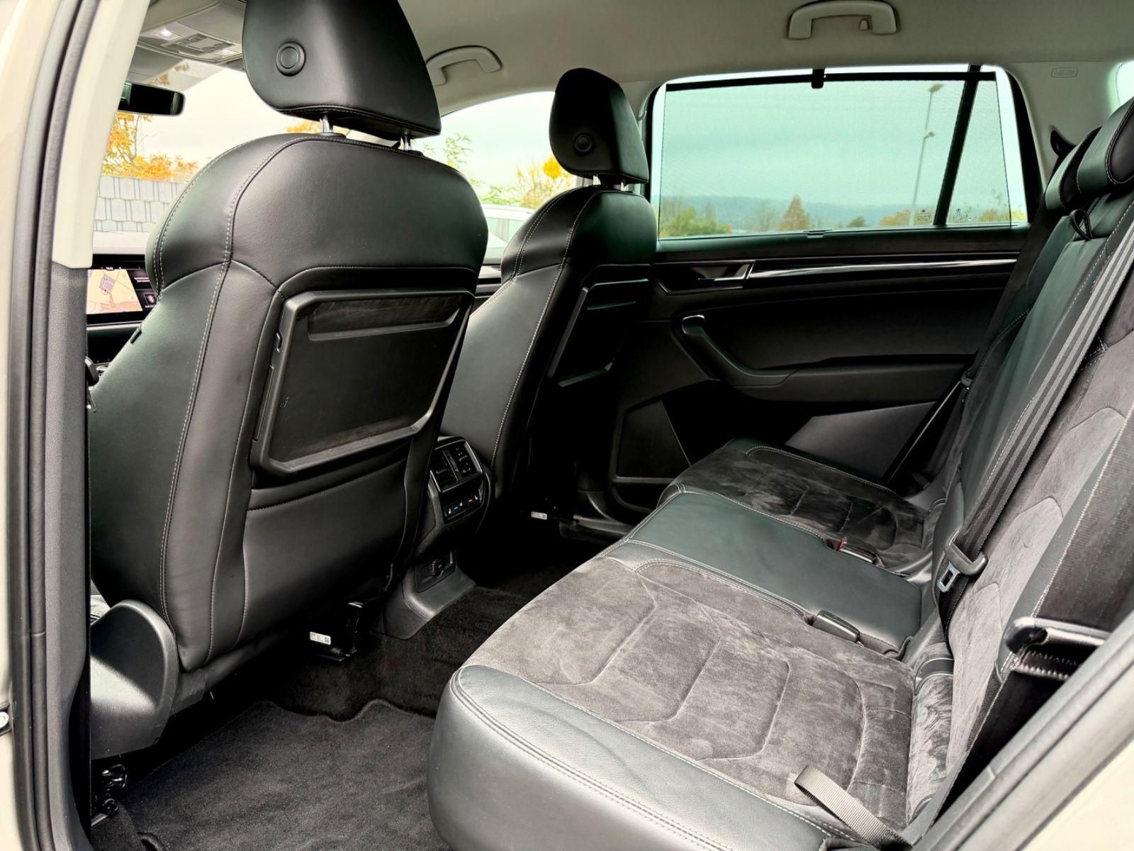 Ambiente-Beleuchtung LED, Fahrassistenz-Paket: Stau- und Notfallassistent, Fahrassistenz-System: Adaptive Fahrwerksregelung (DCC) inkl. Fahrprofilauswahl (Drive Mode Selector), Fahrassistenz-System: Fernlichtassistent, Fahrassistenz-System: Müdigkeitserkennung, Fahrassistenz-System: Verkehrszeichenerkennung, Infotainment-Paket Columbus, Insassen-Schutzsystem proaktiv, Isofix-Aufnahmen für Kindersitz an Beifahrersitz, Kamerasystem 360°, Klapptische in Fahrer- und Beifahrersitzlehne integriert, Klimaanlage Climatronic 3-Zonen, Komfortöffnung für elektr. Heckklappe/-Deckel, LM-Felgen 7x18 (Elbrus), Metallic-Lackierung, Mobile Online Dienste, Reserverad platzsparend, Seitenscheiben hinten und Heckscheibe abgedunkelt (SunSet), Sitzbezug / Polsterung: Alcantara/Leder, Sitzheizung vorn + hinten